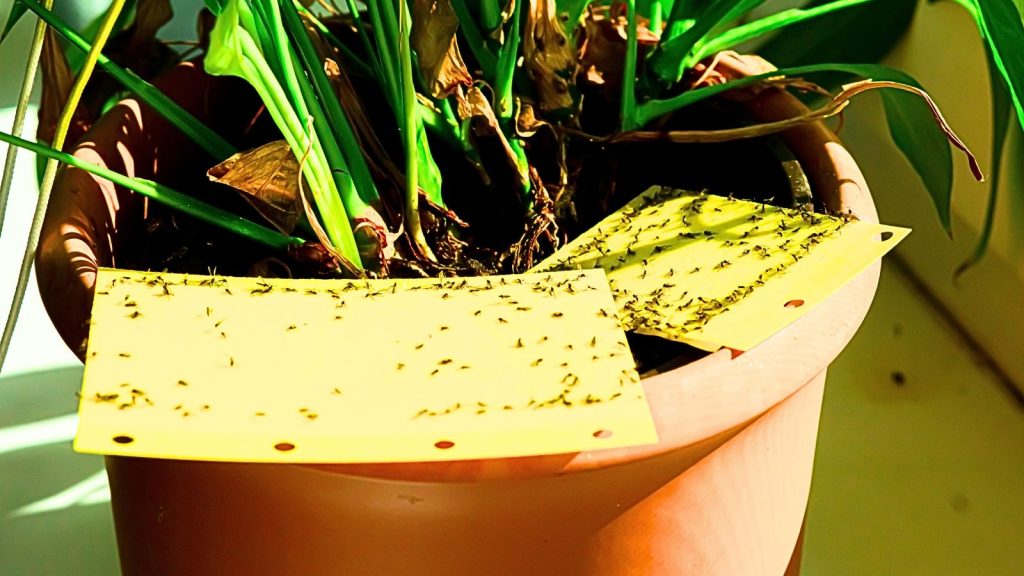 Yellow sticky traps are an easy, non-toxic way to catch adult gnats before they can lay more eggs. Simply place a few traps near the soil or hang them near your plants. Over time, these traps will help reduce the gnat population.